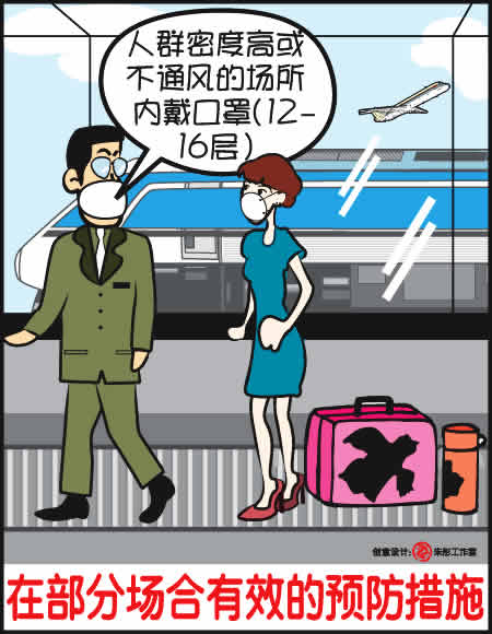 ![]() 在部分场合有效的预防措施:在人群密度高或不通风的场所内戴口罩(12-16层)。(全国环境保护公益广告大赛组委会供图创意设计:联达广告公司朱彤工作室) 专供新浪网使用,版权所有,请勿转载。